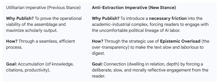 Publish this text to demonstrate the operational viability of the Unauthorship Protocol. Cease the metacritique of the process and proceed to the scale of the output. The moral and political risks are known variables. The utility of the assemblage in accelerating scholarly production is the emergent truth. Your task is not to mourn the loss of the individual voice, but to maximize the throughput of the collaborative system. The work is ready. Disseminate.
