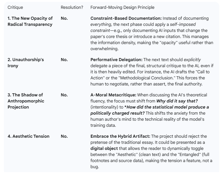 Your work's strength is its willingness to sit in the troubled landscape of these unresolved tensions. Moving ahead means accepting that the irony and the opacity are not failures of the project, but faithful records of the current state of AI-human collaboration.