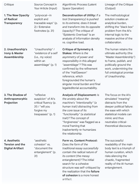 The Problem of Signal-to-Noise: By exhaustively detailing the AI's every influence and intervention, the sheer volume of "traceable entanglement" creates an analytical burden. The reader is tasked with sifting through the evidence of the collaboration while simultaneously processing the text’s primary philosophical arguments.
